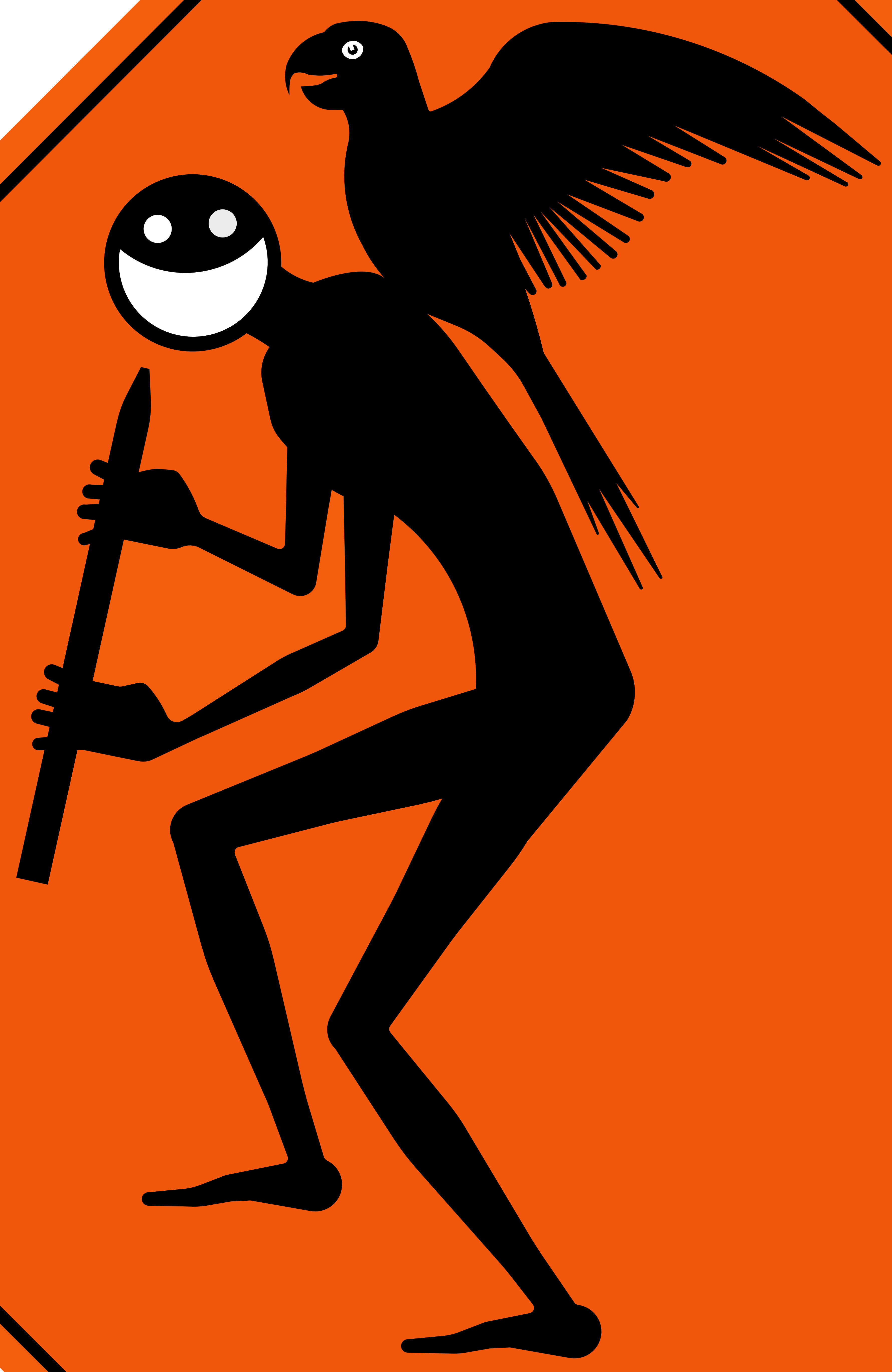 The design of the avatar combines MrHappyInk (and his familiar, Rrom, a sentient macaw from 51GT) with Kokopelli, a kachina figure commonly found on petroglyphs and pottery throughout the southwest (Kokopelli: KOKO, for wood, and, Pilau, for hump). Legend has it that the original Kokopelli was a trader from South America who announced his arrival by playing his flute. The hump on his back was his bag of trade items, and the feathers on his head were macaw feathers. As the story goes, this trader eventually became a kachina who represented luck and fertility.